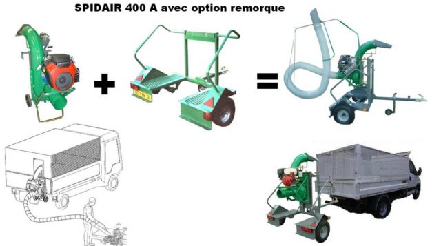 SPIDAIR 400 A SPIDAIR 400 A est un aspirateur broyeur conçu pour les professionnels du paysage. Il est destinée aux travaux de nettoyage de la cité : feuilles mortes, gazons, tailles de haies et détritus Le SPIDAIR 400 A est autonome, il peut être mise en place sur la ridelle et déplacé par une seule personne. (Pas besoin de chariot complémentaire non intégré, de support ou de desserte) |